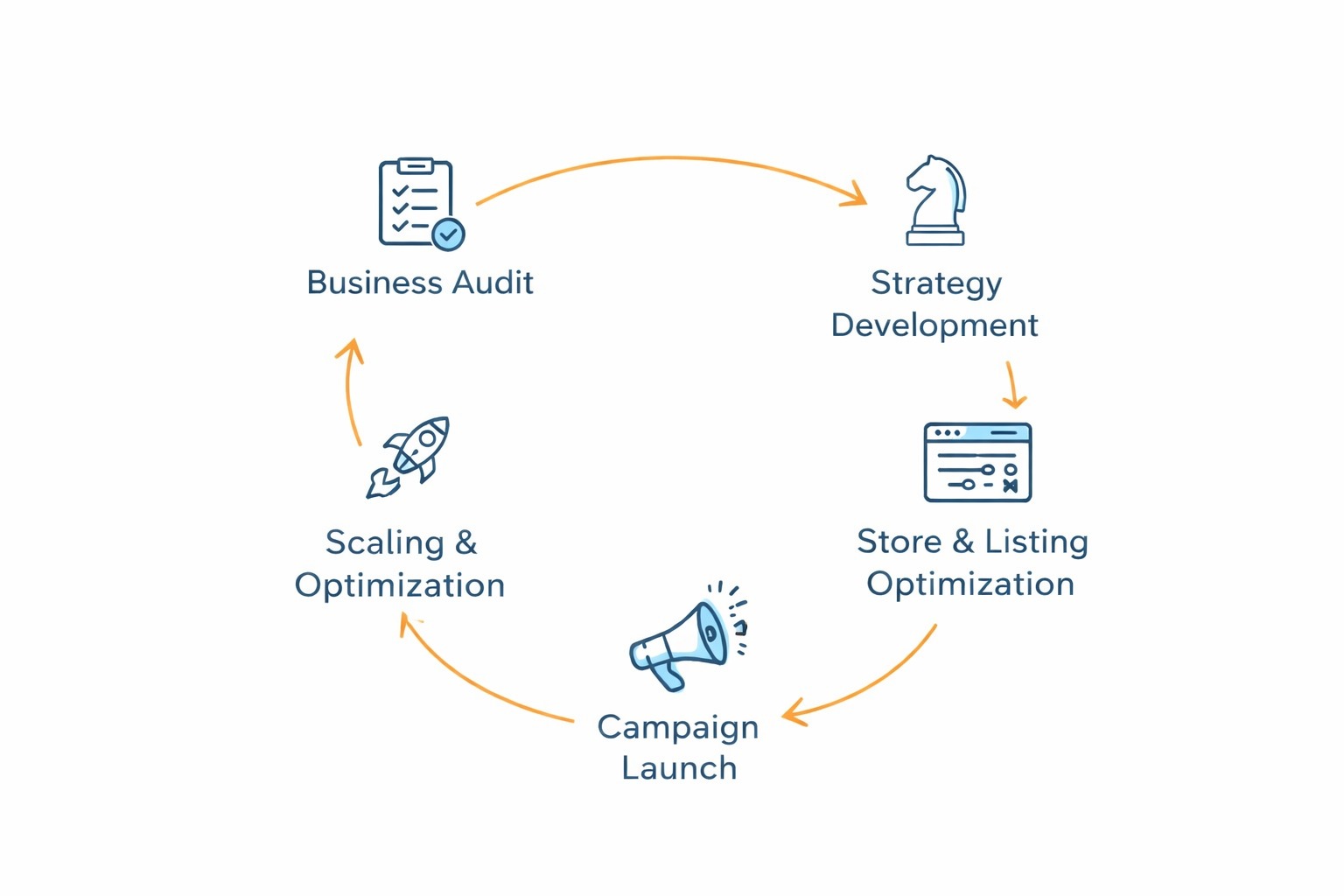 We follow a structured process to help businesses launch, optimize, and grow across Amazon, Shopify, and other online marketplaces.
